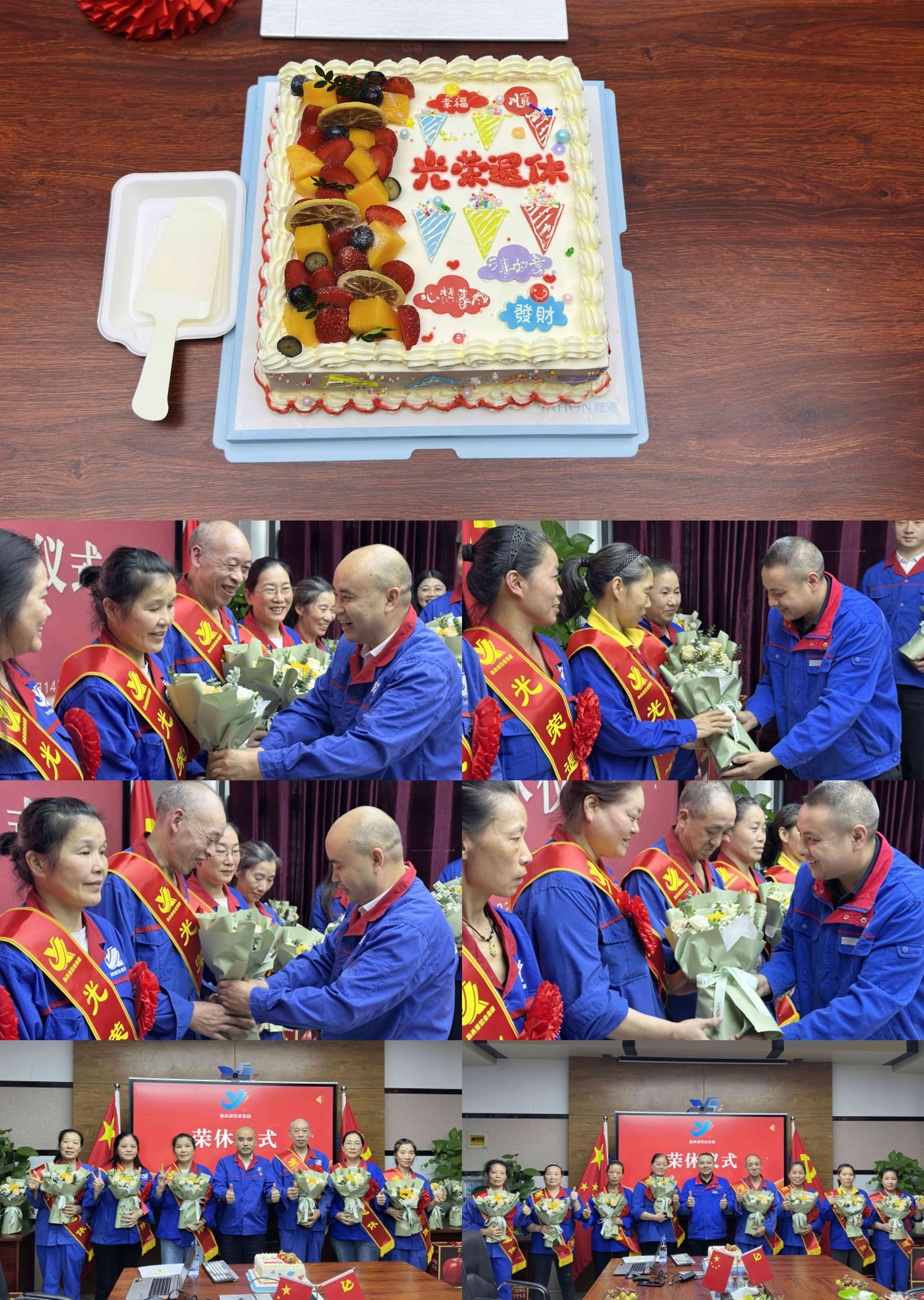 在熱烈的掌聲中,榮休儀式正式舉行。劉總為榮休員工們獻上鮮花與禮品,并親切合影留念。一份特別的榮休蛋糕,更是將甜蜜與祝福融入其中。這份沉甸甸的關懷,承載著公司最崇高的敬意與最真摯的祝福,是對過往奉獻的最高禮贊。