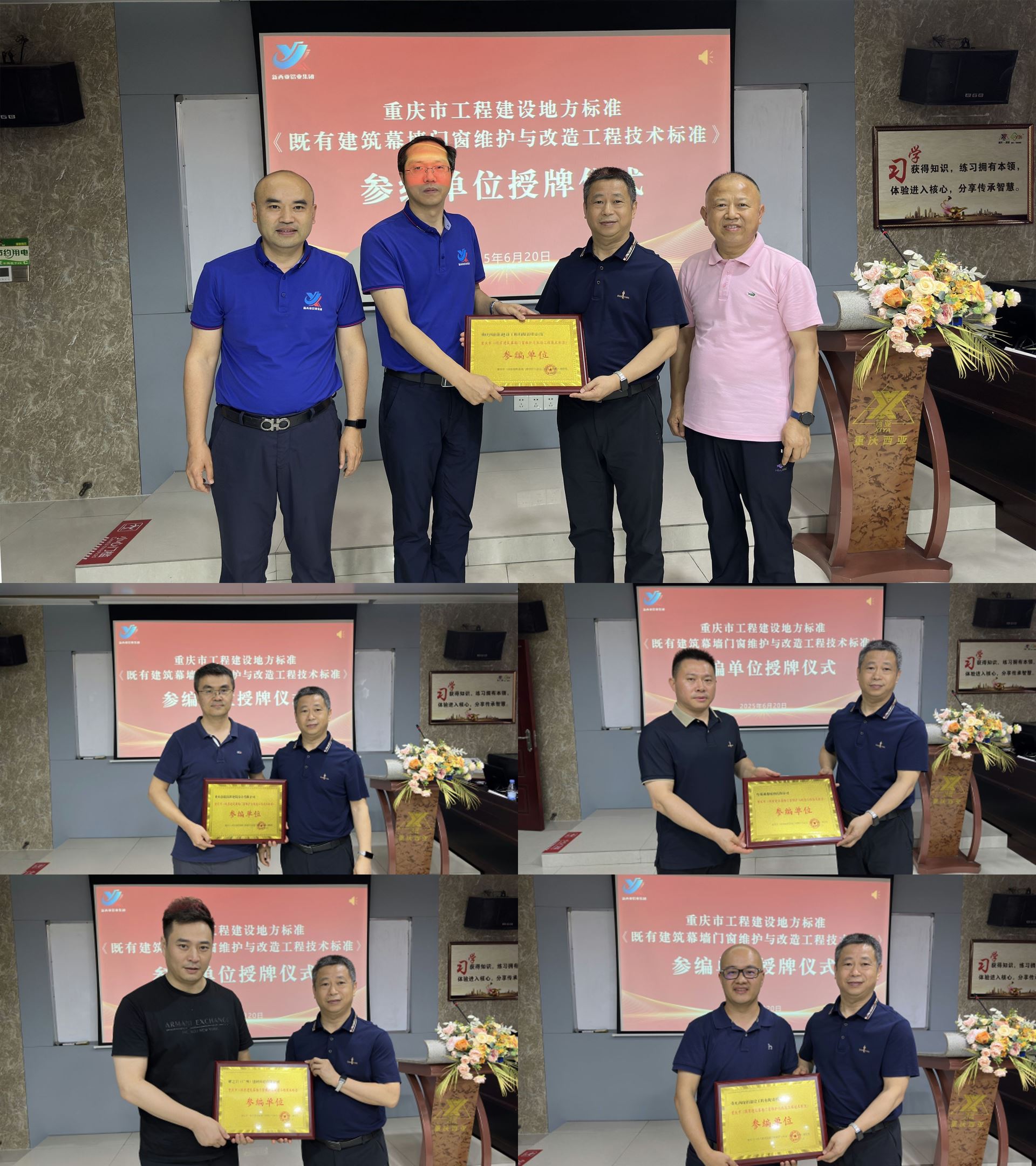 緊接著,重慶市《既有建筑幕墻門窗維護(hù)與改造工程技術(shù)標(biāo)準(zhǔn)》編制組負(fù)責(zé)人劉建、王勤向新西亞鋁業(yè)、重慶西南鋁建設(shè)工程有限責(zé)任公司、曜之巖(廣州)建材科技有限公司等多家參編單位授牌。此環(huán)節(jié)標(biāo)志著各參編單位將共同承擔(dān)起該地方標(biāo)準(zhǔn)編制的責(zé)任。